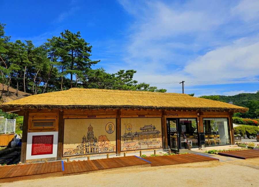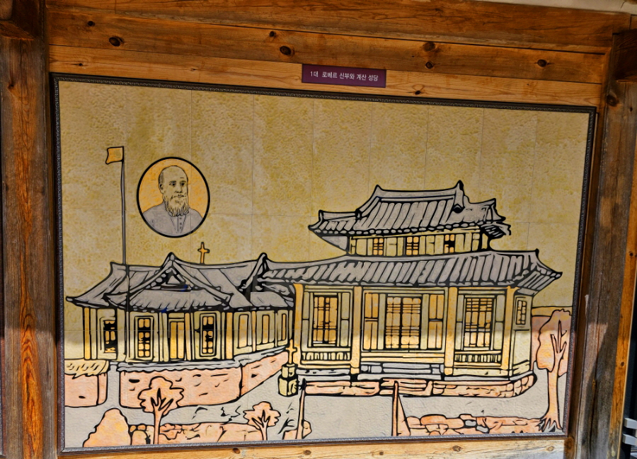 카페 & 벽면에 로베르 신부와 대구 계산성당 그림