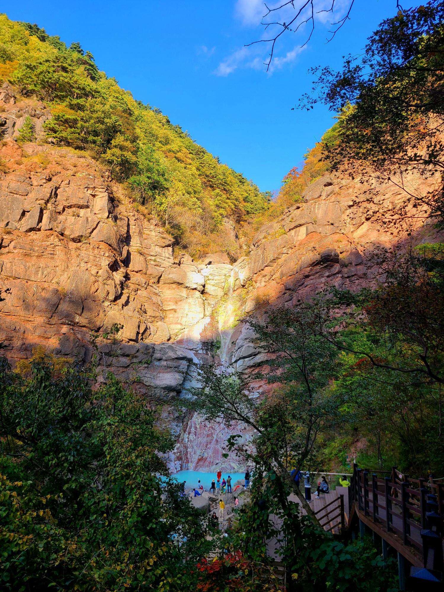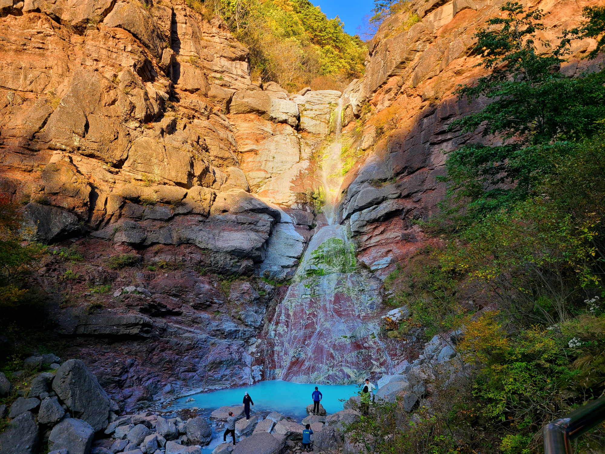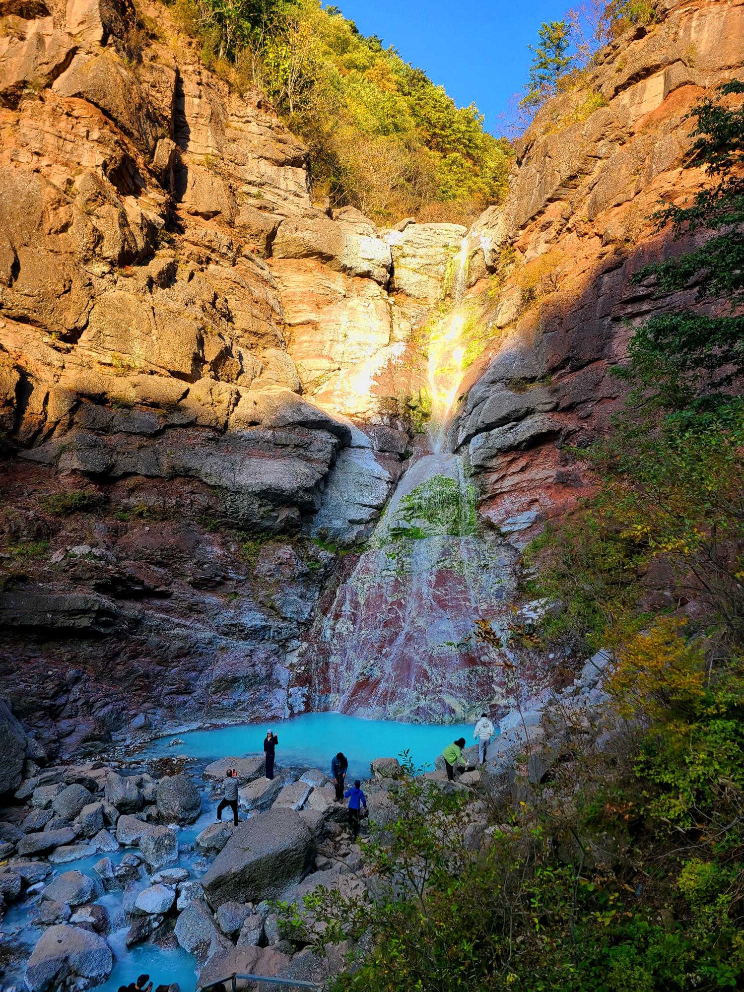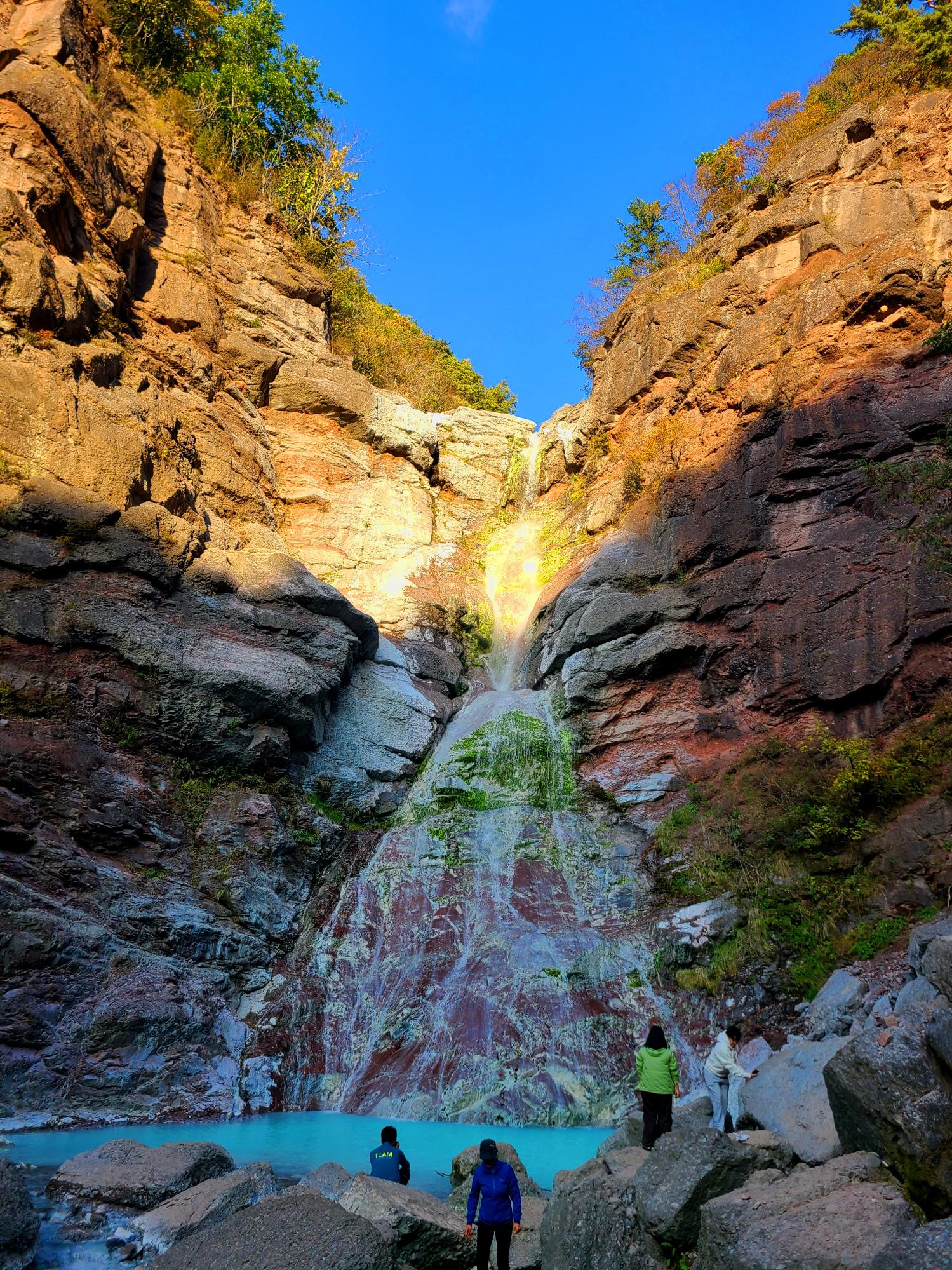 최근에 매스컴을 타고 알려져 많은 사람들이 찾고 있는 미인폭포의 가장 특징은 석회질 성분으로 인한 신비로운 비취색의 물빛이다. 가까이 보다 조금 멀리서 그리고 햇살에 비치는 물빛이 더 예쁘다고 한다. 오후 4시쯤 방문이라 그늘이 되었네요. 13~14시 방문 추천드려요