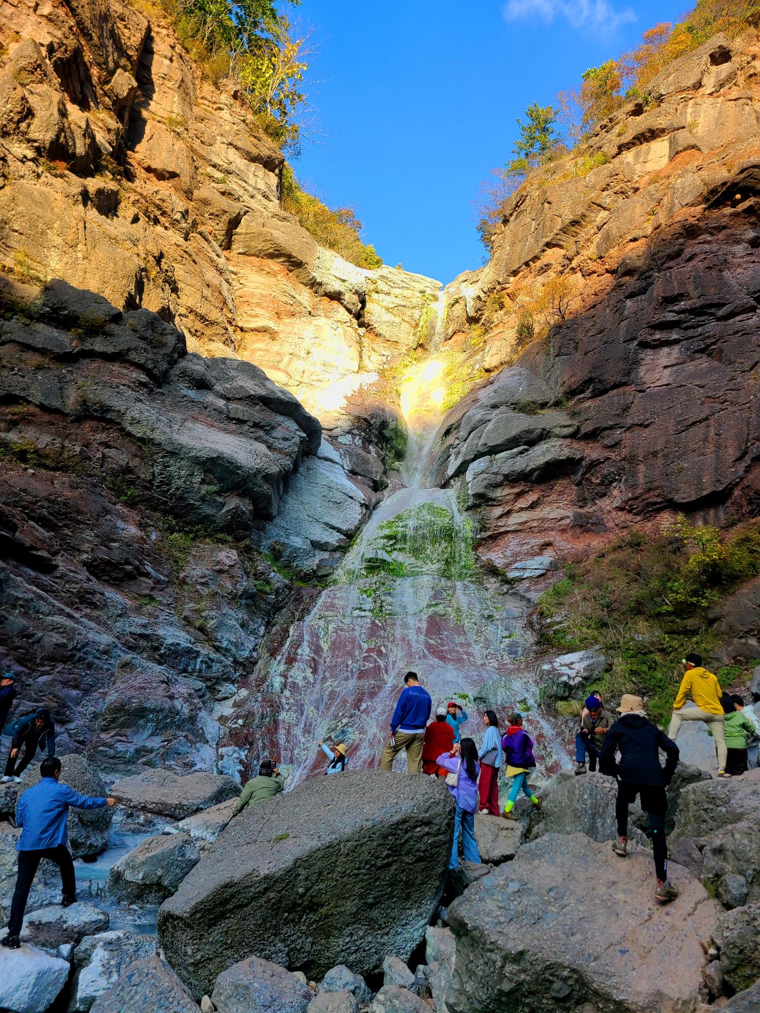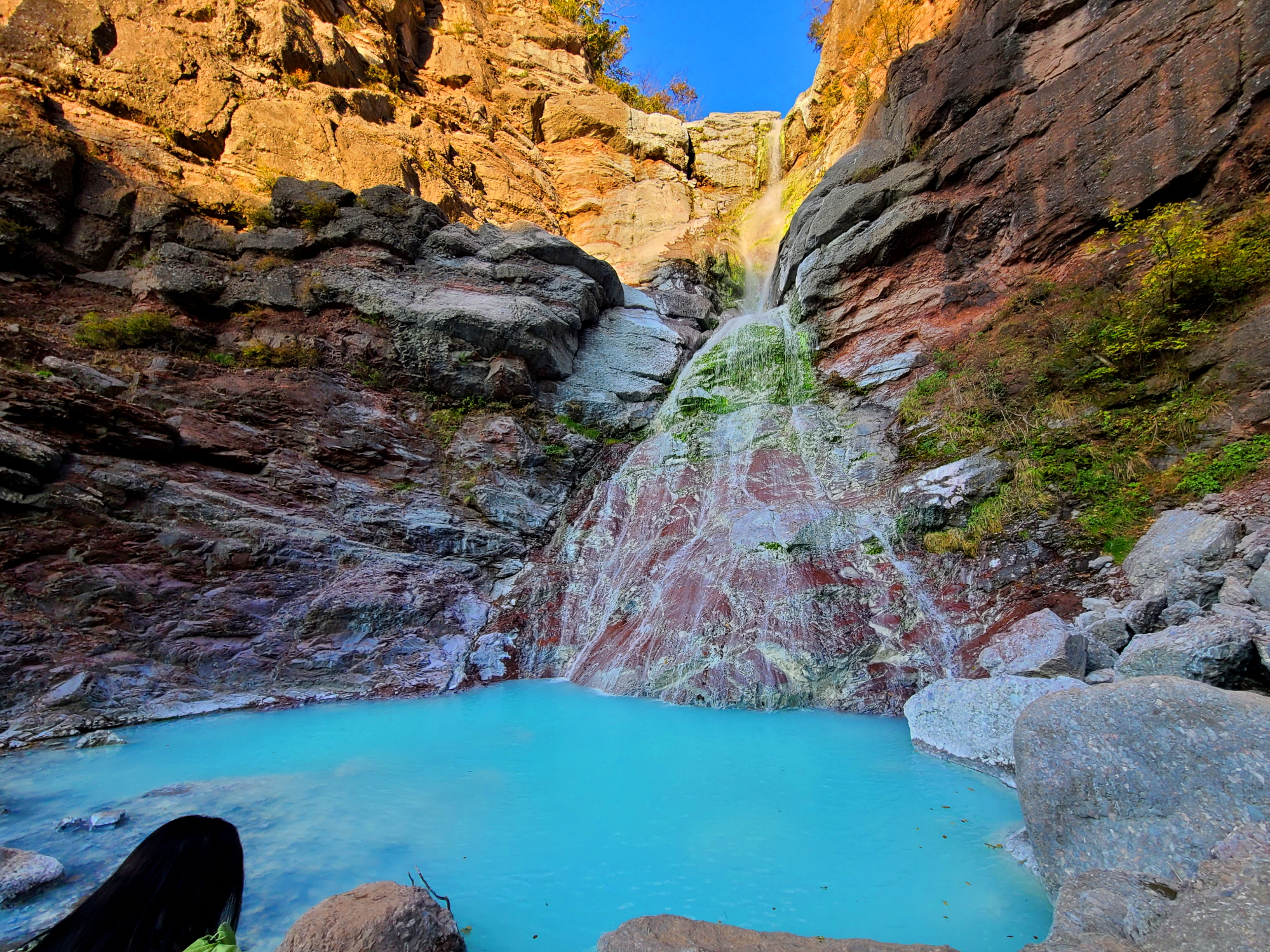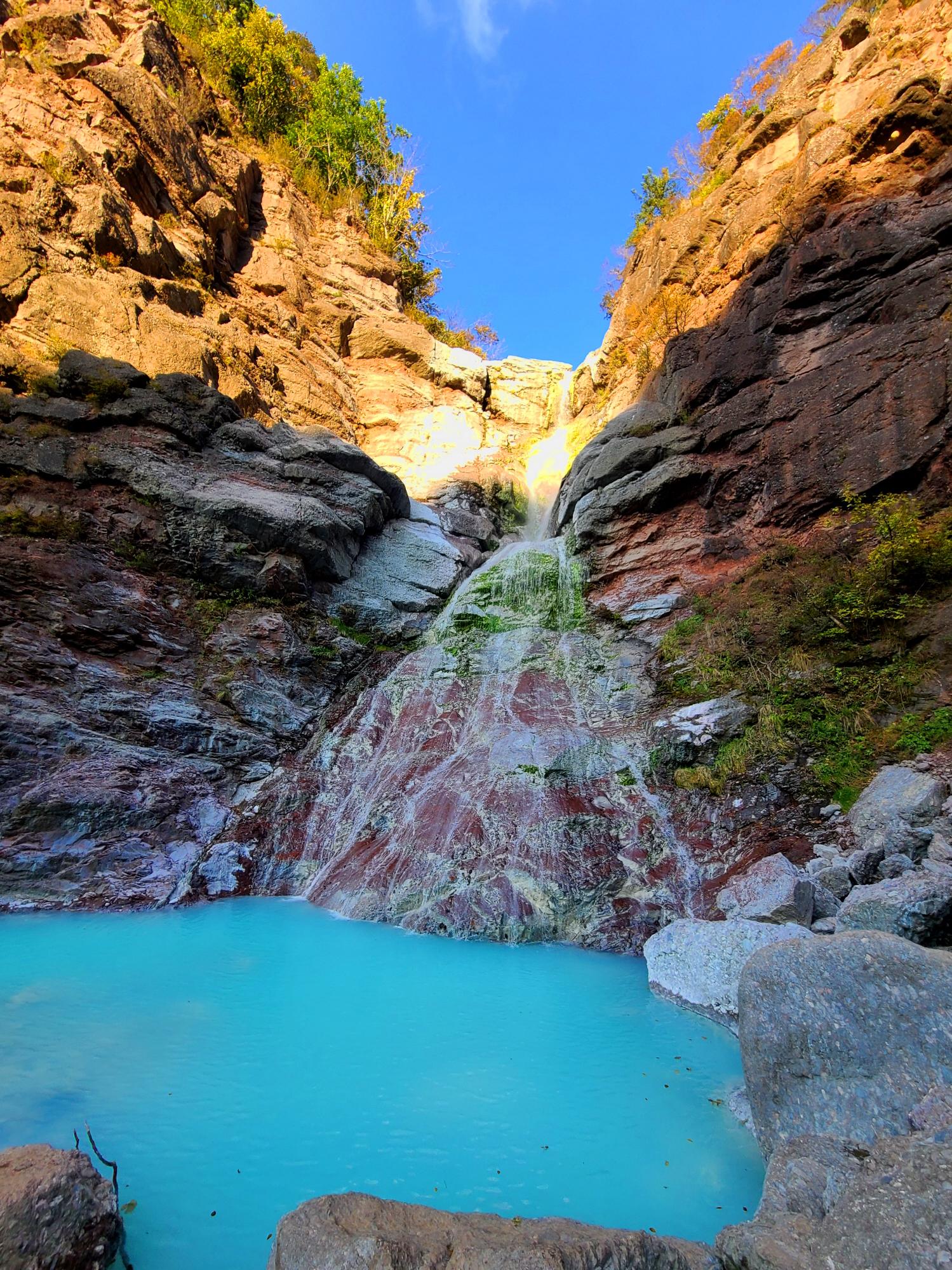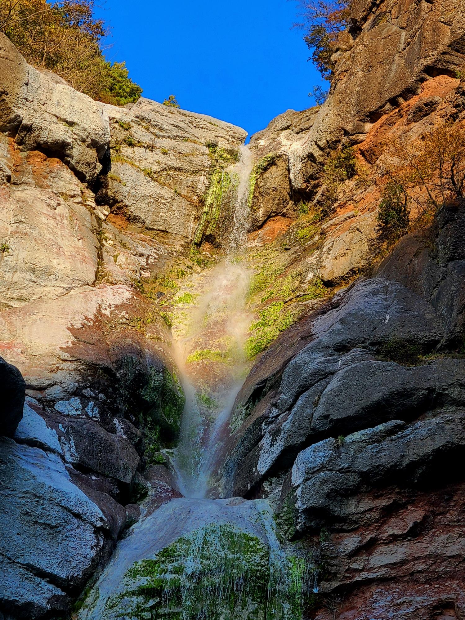 최근에 매스컴을 타고 알려져 많은 사람들이 찾고 있는 미인폭포의 가장 특징은 석회질 성분으로 인한 신비로운 비취색의 물빛이다. 가까이 보다 조금 멀리서 그리고 햇살에 비치는 물빛이 더 예쁘다고 한다. 오후 4시쯤 방문이라 그늘이 되었네요. 13~14시 방문 추천드려요