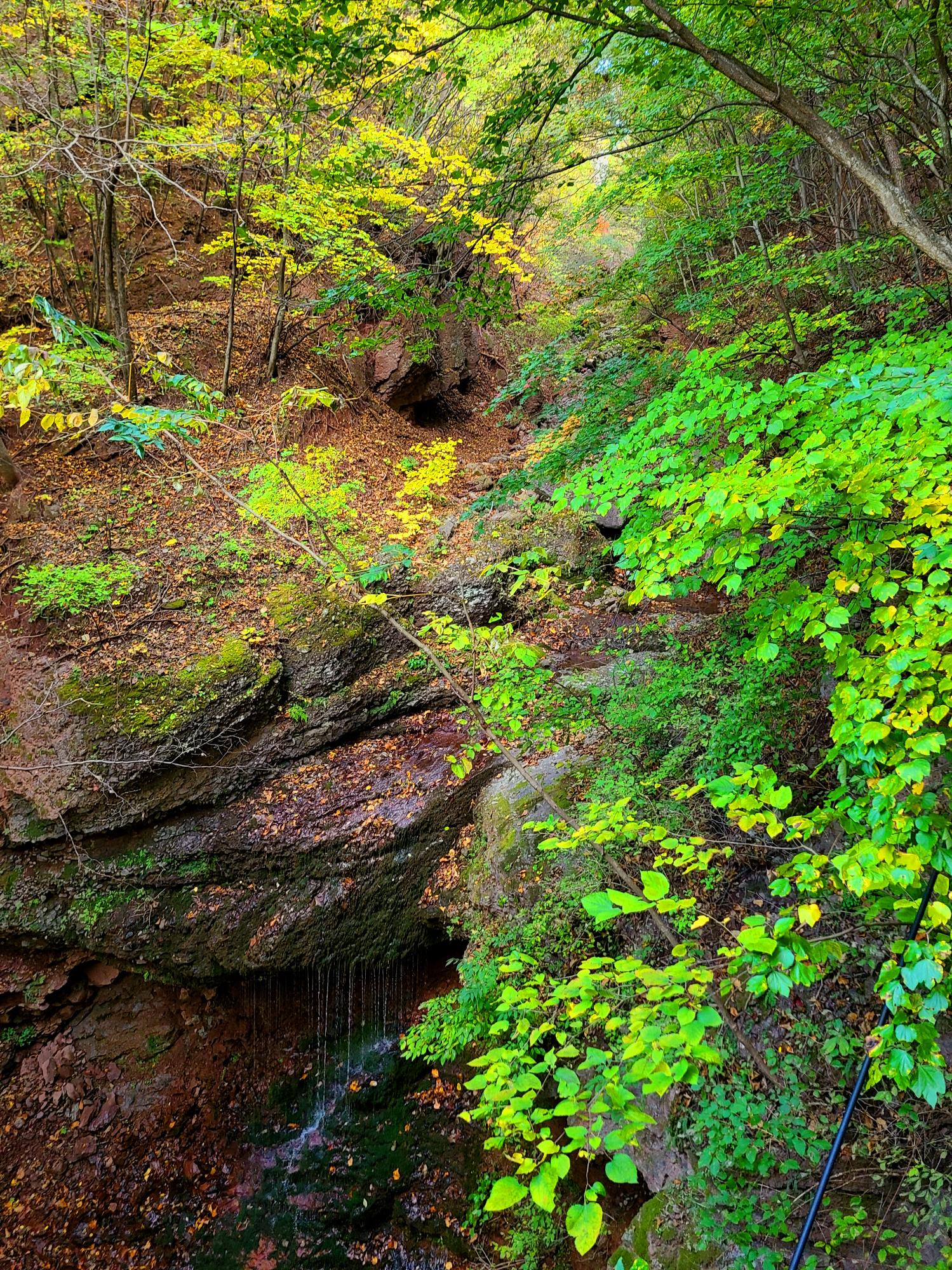 입구 건너편 구 도로변 임시주차장에 주차를 하고 폭포계곡으로 가파르게 내려섭니다.