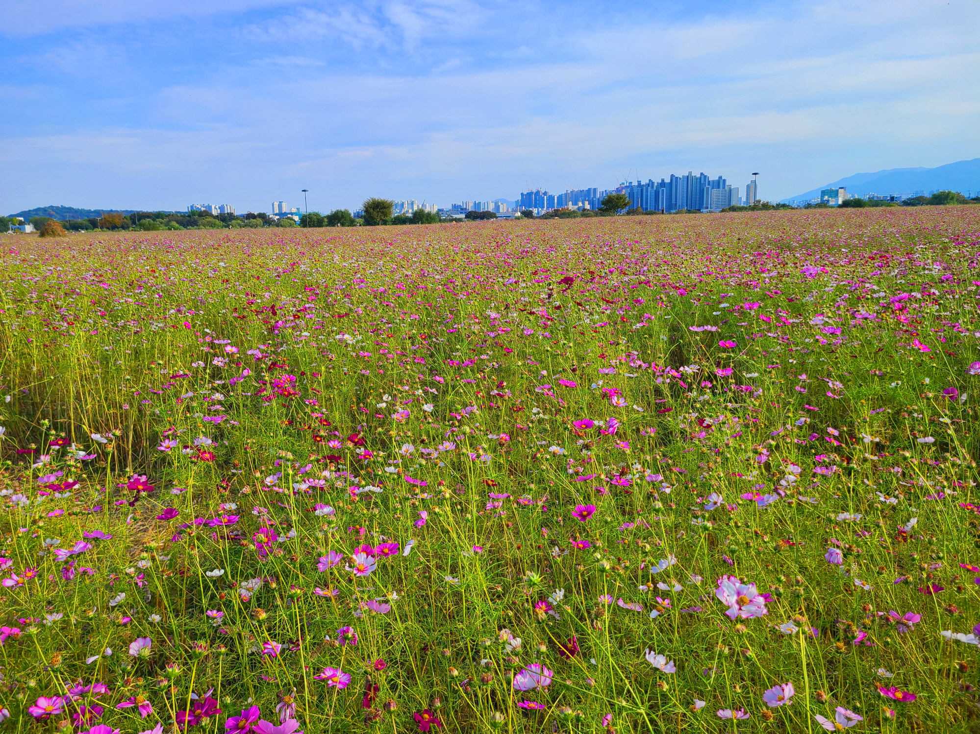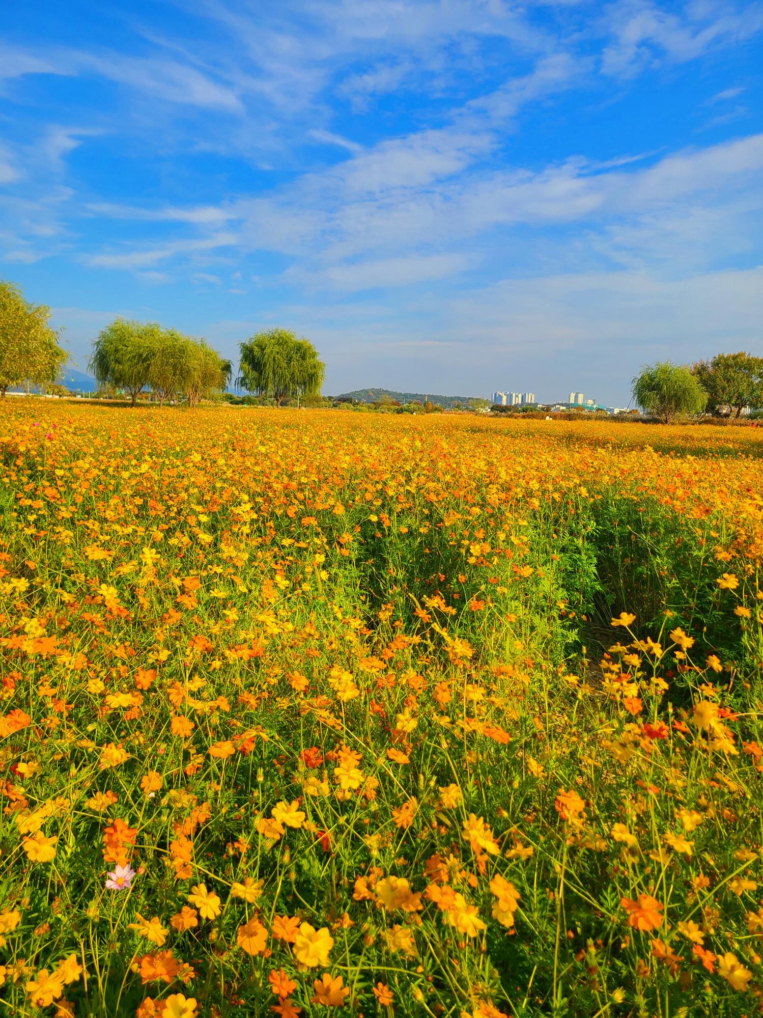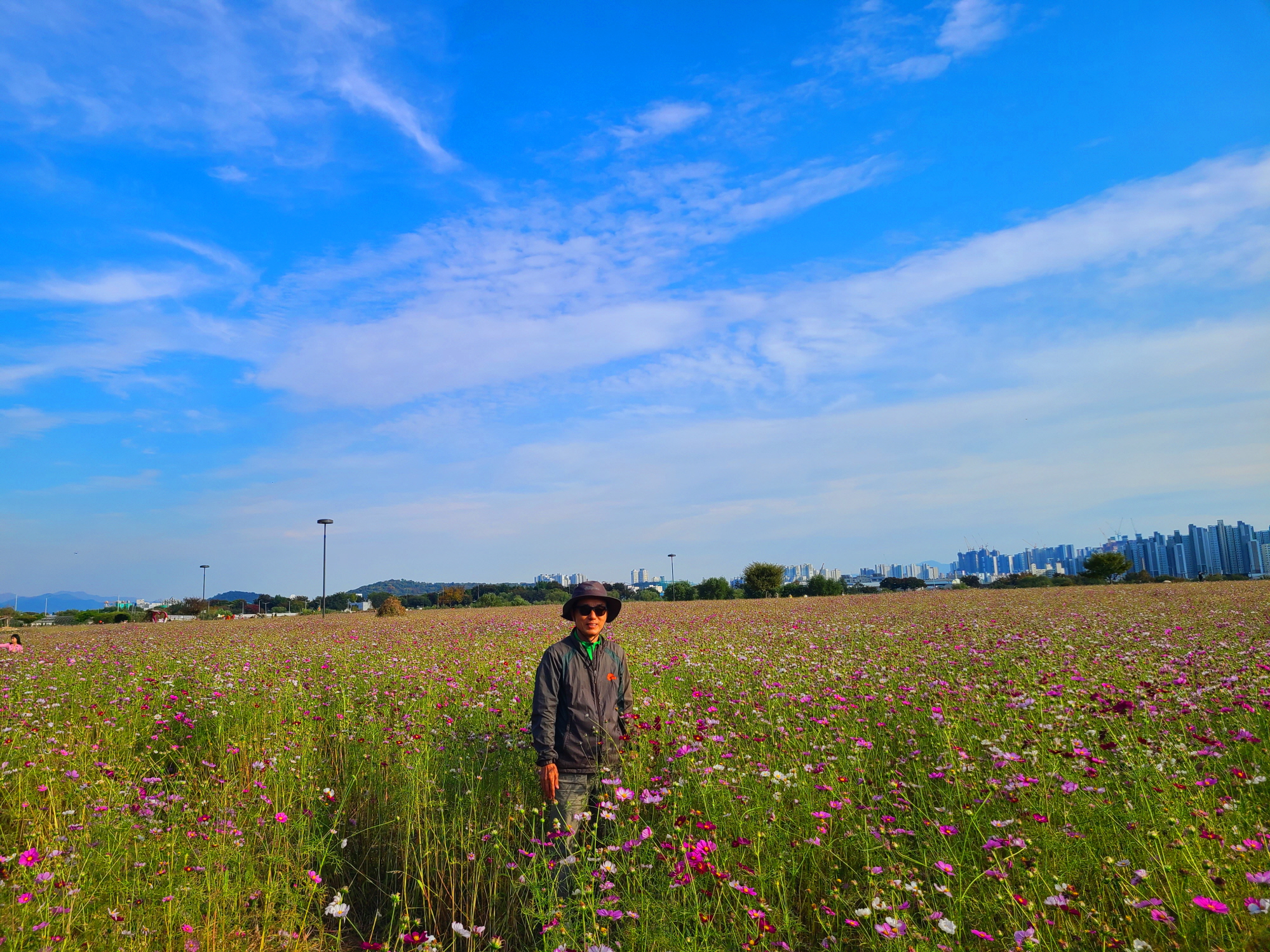 하중도의 시그니쳐 끝이 보이지 않는 6만 여평의 코스모스는 크게 두 종류다. 우리가 흔히 보아왔던 '핑크색 코스모스'와 생소한 노란색, 주황색의 '황화 코스모스'다. 핑크색 코스모스는 거의 끝무렵이라 피어 있는 것보다 지고 있는 꽃이 더 많은 것 같다.