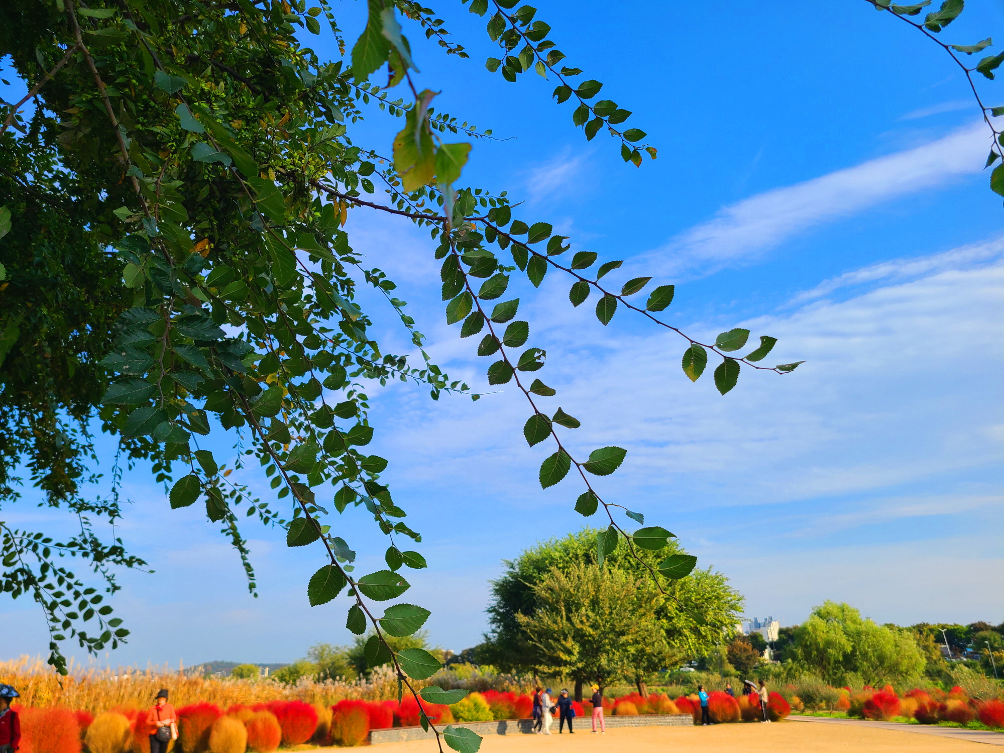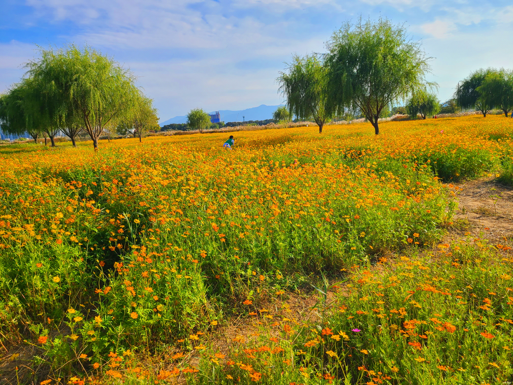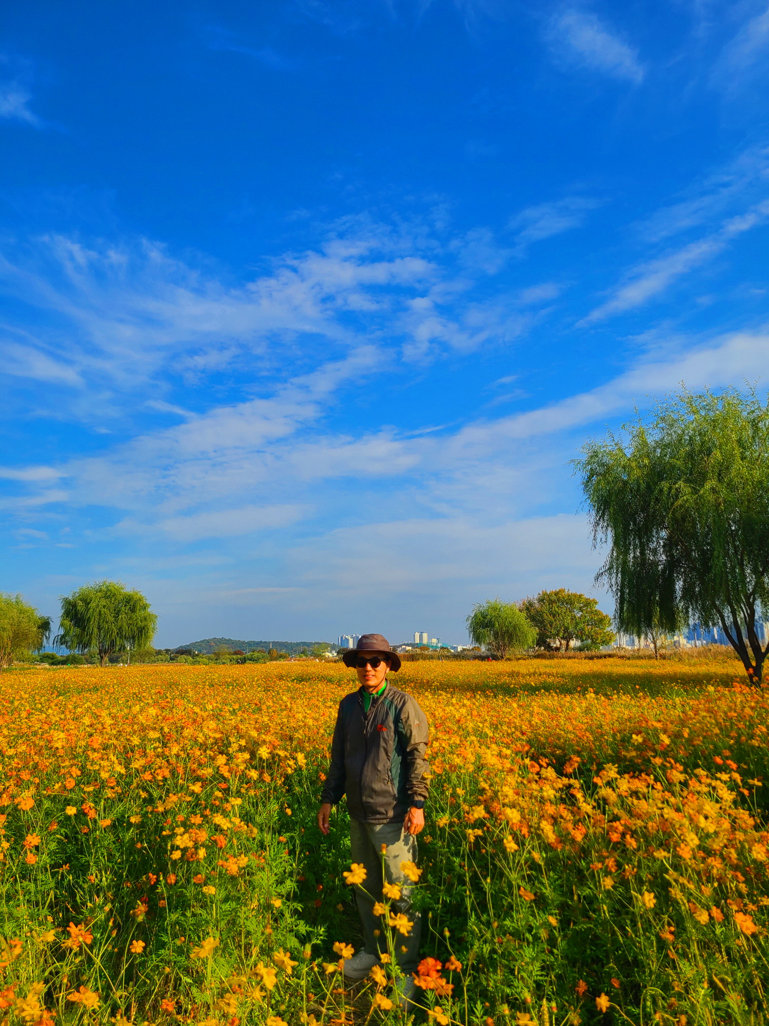 하중도의 시그니쳐 끝이 보이지 않는 6만 여평의 코스모스는 크게 두 종류다. 우리가 흔히 보아왔던 '핑크색 코스모스'와 생소한 노란색, 주황색의 '황화 코스모스'다. 핑크색 코스모스는 거의 끝무렵이라 피어 있는 것보다 지고 있는 꽃이 더 많은 것 같다.