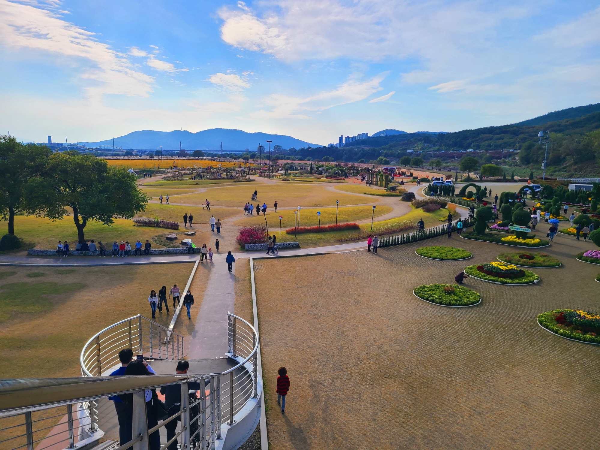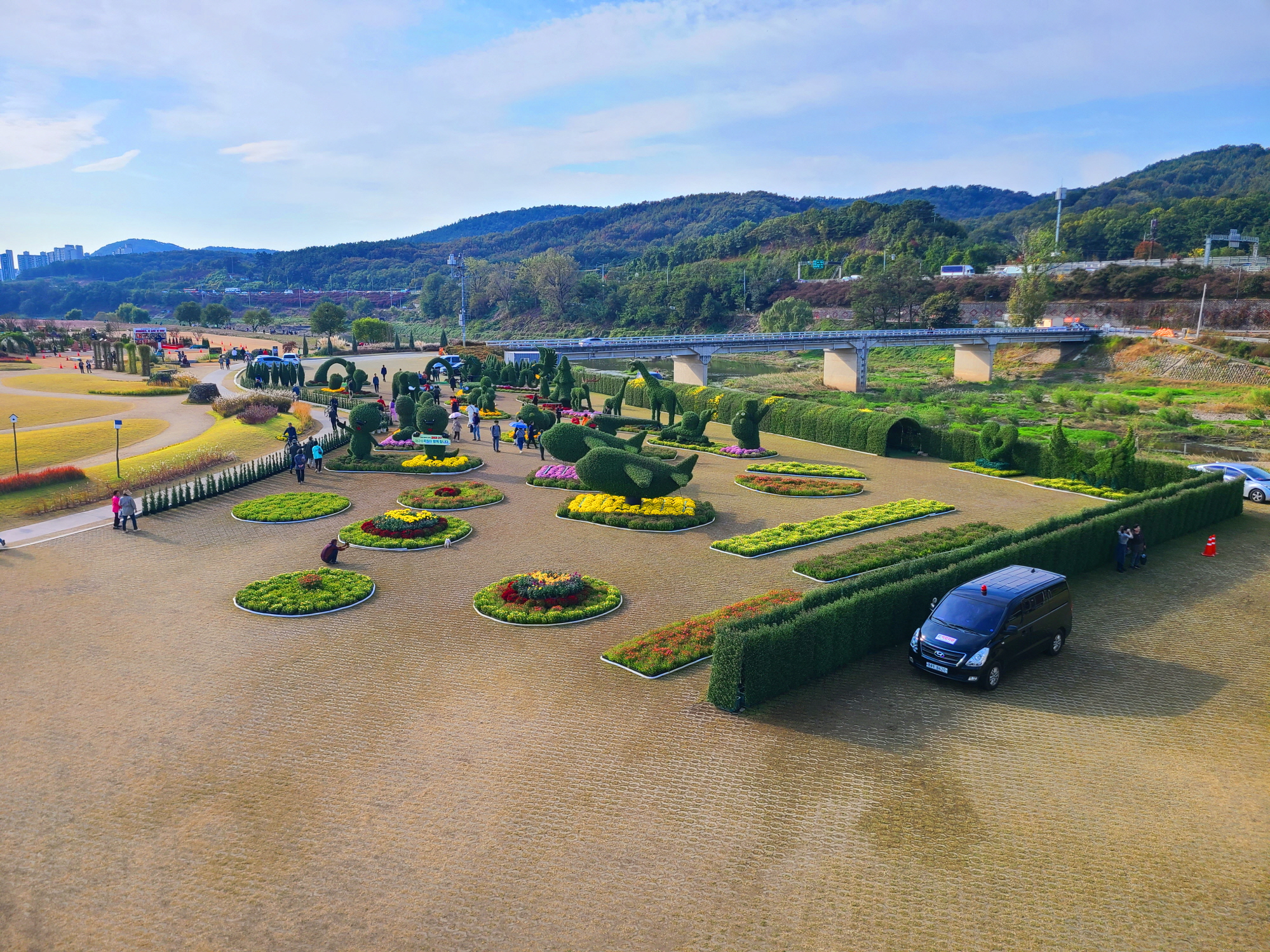 노곡교 철계단을 내려서면 바로 우측이 대구수목원 국화 전시장이고 가운데가 10,13~17일까지 개최한 정원박람회 모습, 그 뒤로 멀리 보이는 주황색이 코스모스 단지다.
