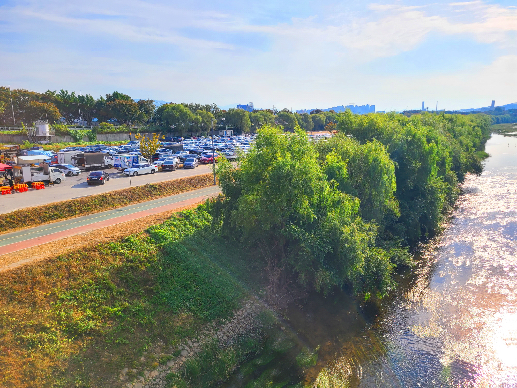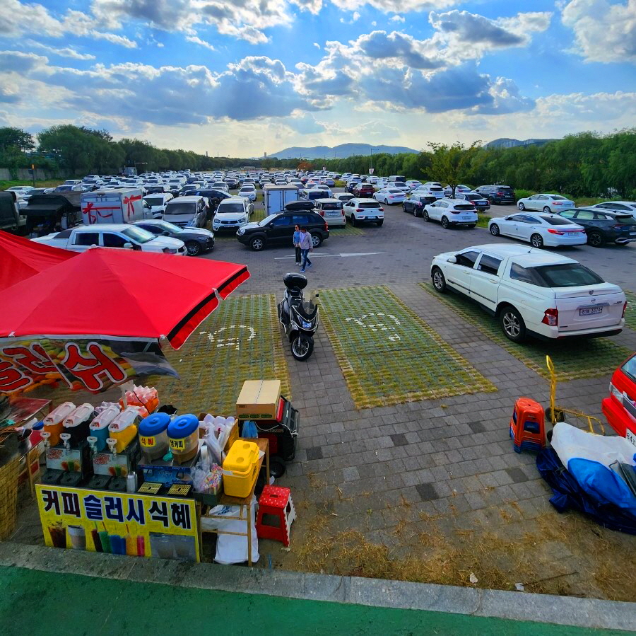 신천대로에서 우측으로 내려서서 강변 따라가면 좌측으로 꽤 넓은 주차장이 나온다. 평일 <10.24일, 화> 임에도 주차장은 거의 만차다. 무심코 안쪽까지 갔다 주차 공간이 없어 입구 쪽으로 다시 돌아 나왔네요. 주말에는 주차에 어려움을 격지 않을까 싶다.