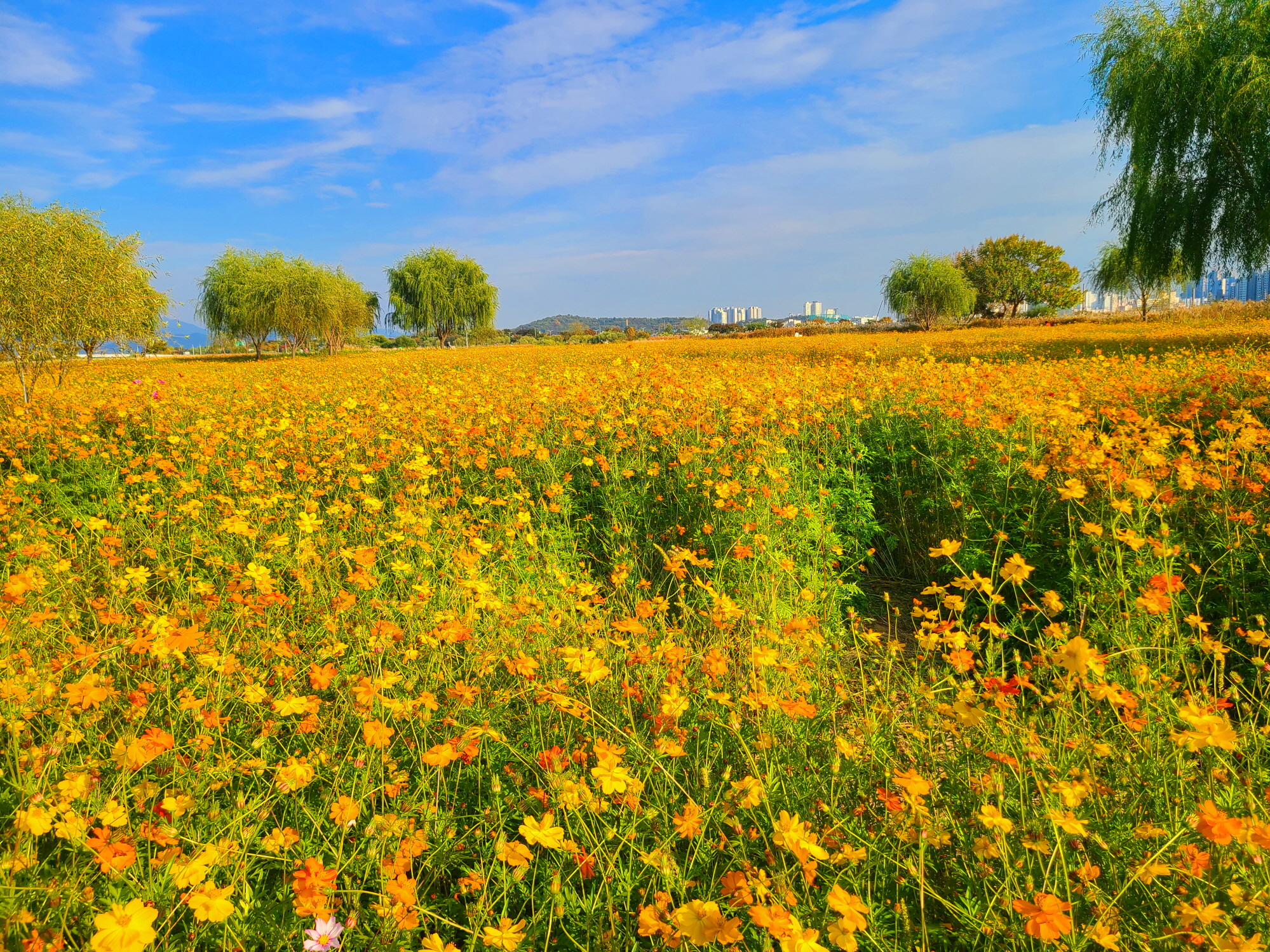 노곡교에서 바라본 멀리 주황색 물결 하중도 '황화 코스모스'