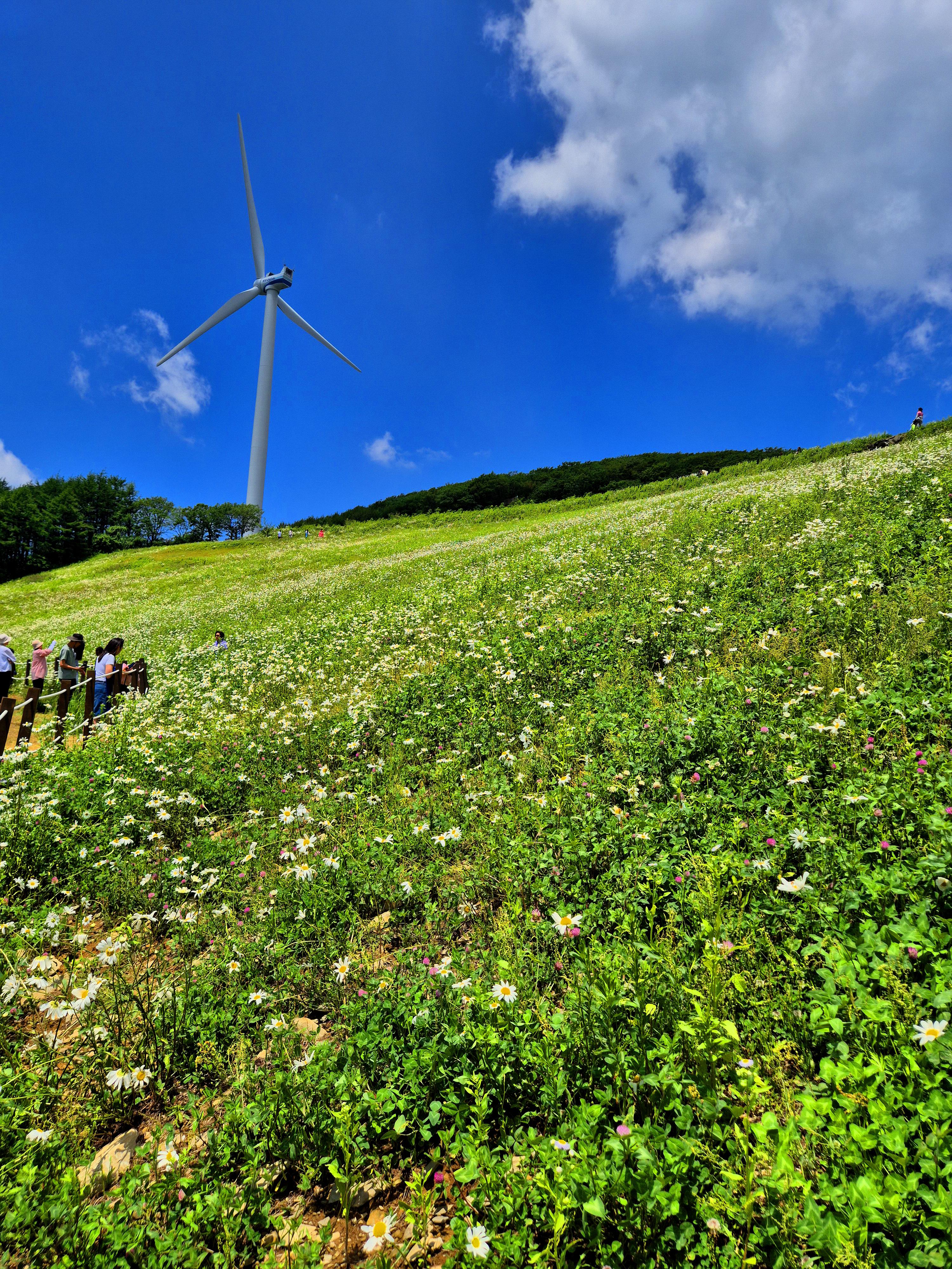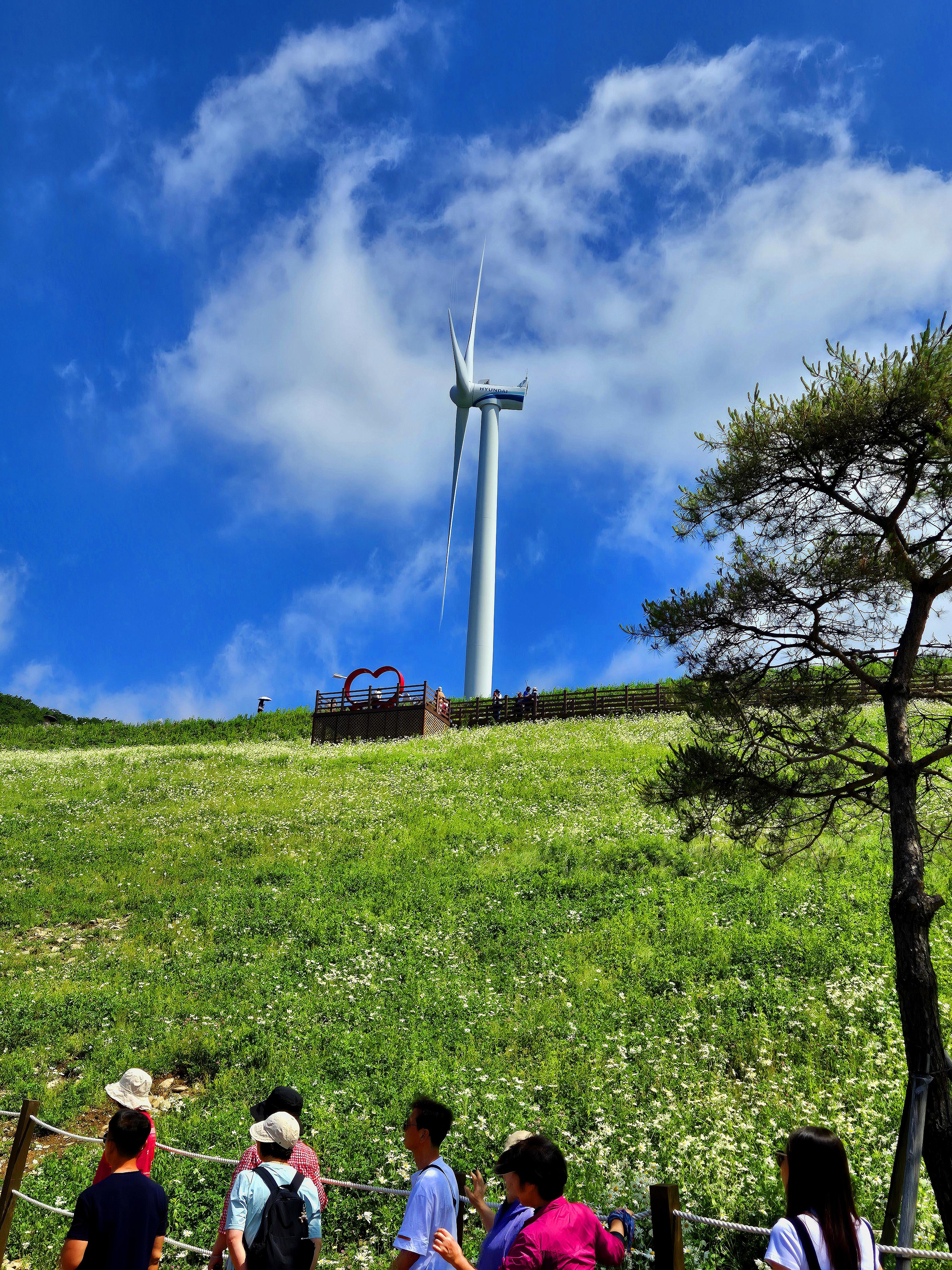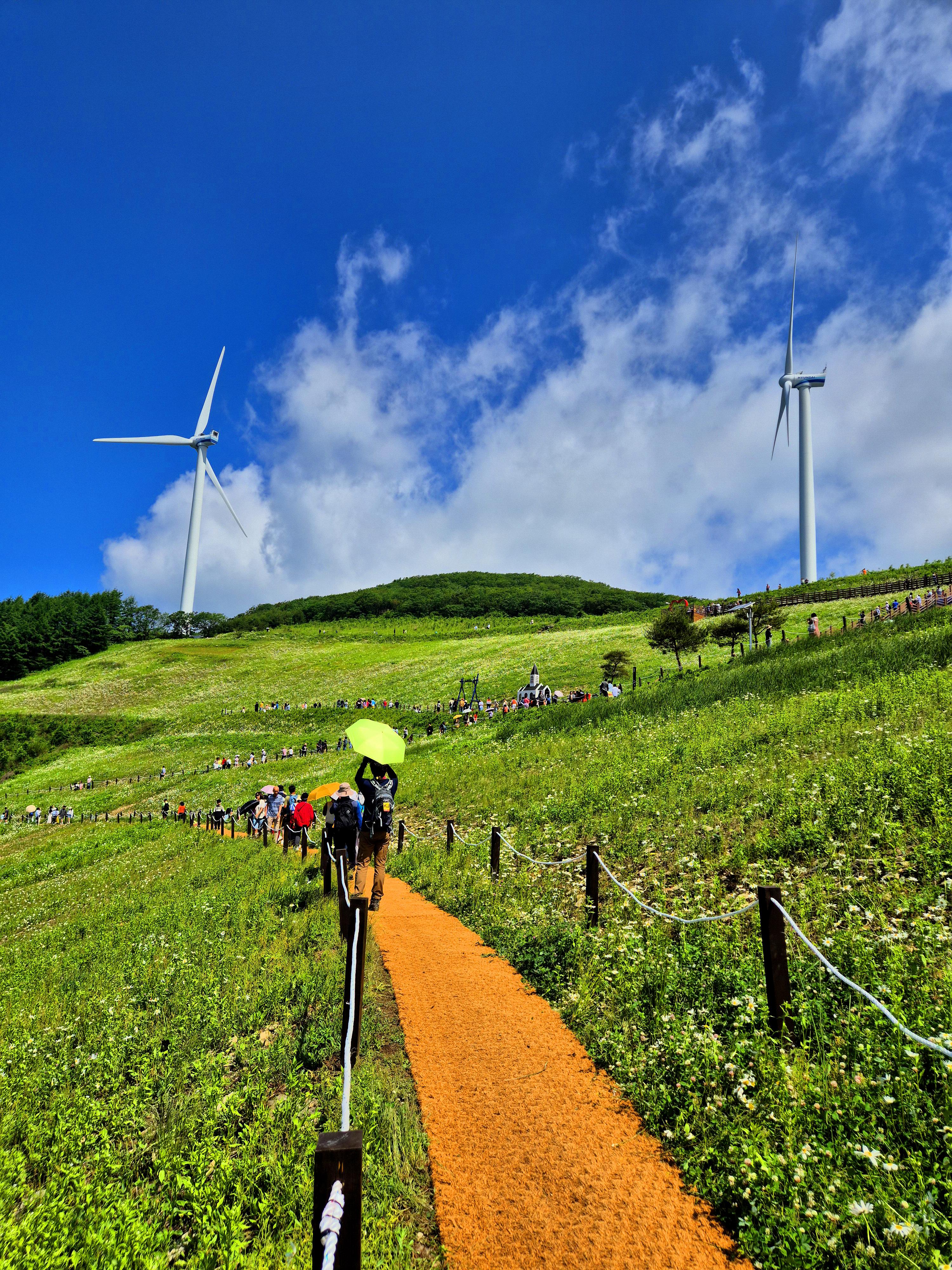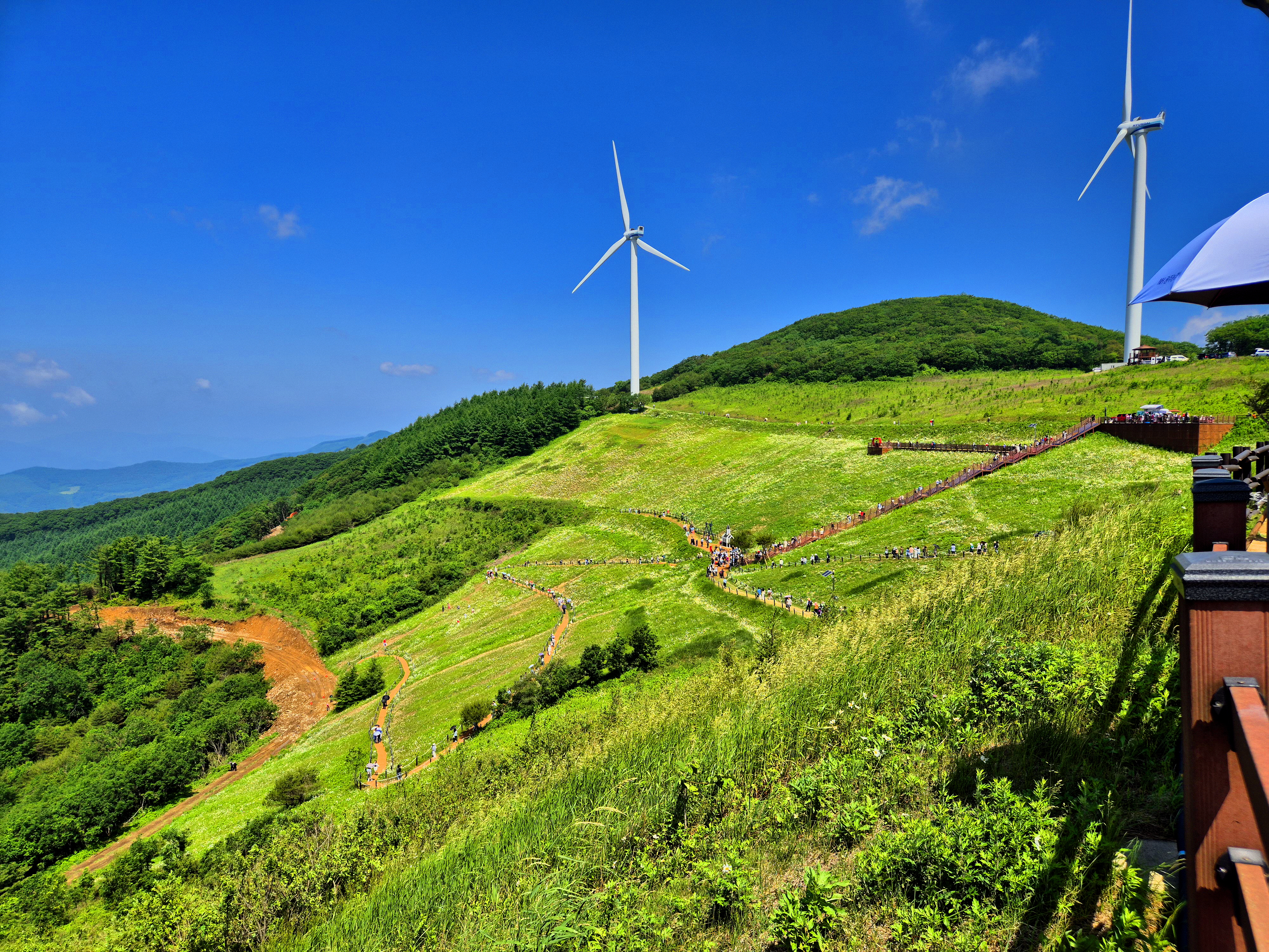 평창 청옥산 육백마지기는 ‘볍씨 육백 말을 뿌릴 수 있을 정도로 넓은 평원’이라 하여 붙여진 지명이다. 오늘날 육백마지기는 자동차로 쉽게 오를 수 있는 산 정상이자 자연 친화적 관광명소로 떠올랐다. 산길을 따라 올라가다 보면 능선을 따라 풍력발전기가 보이기 시작한다.