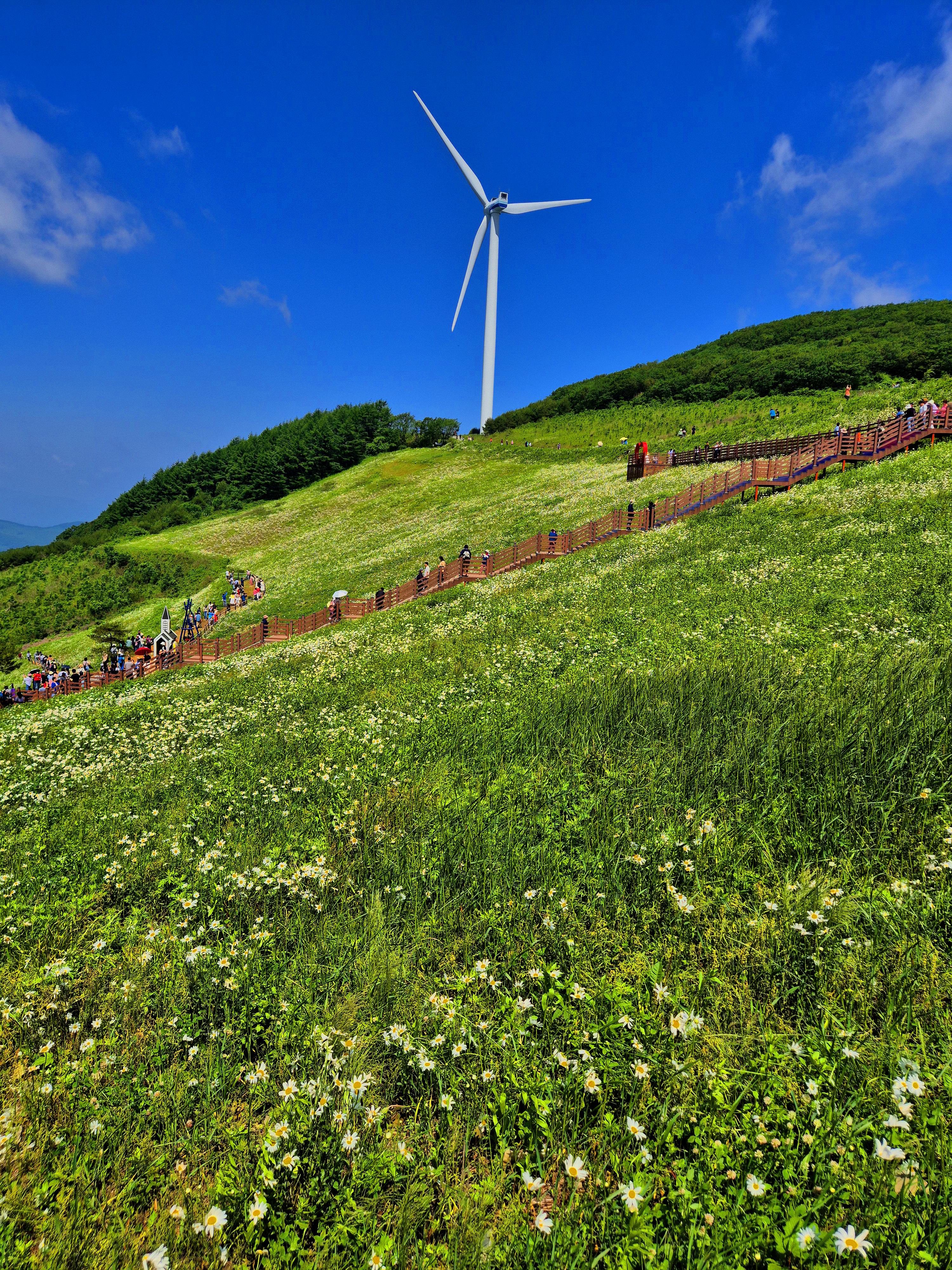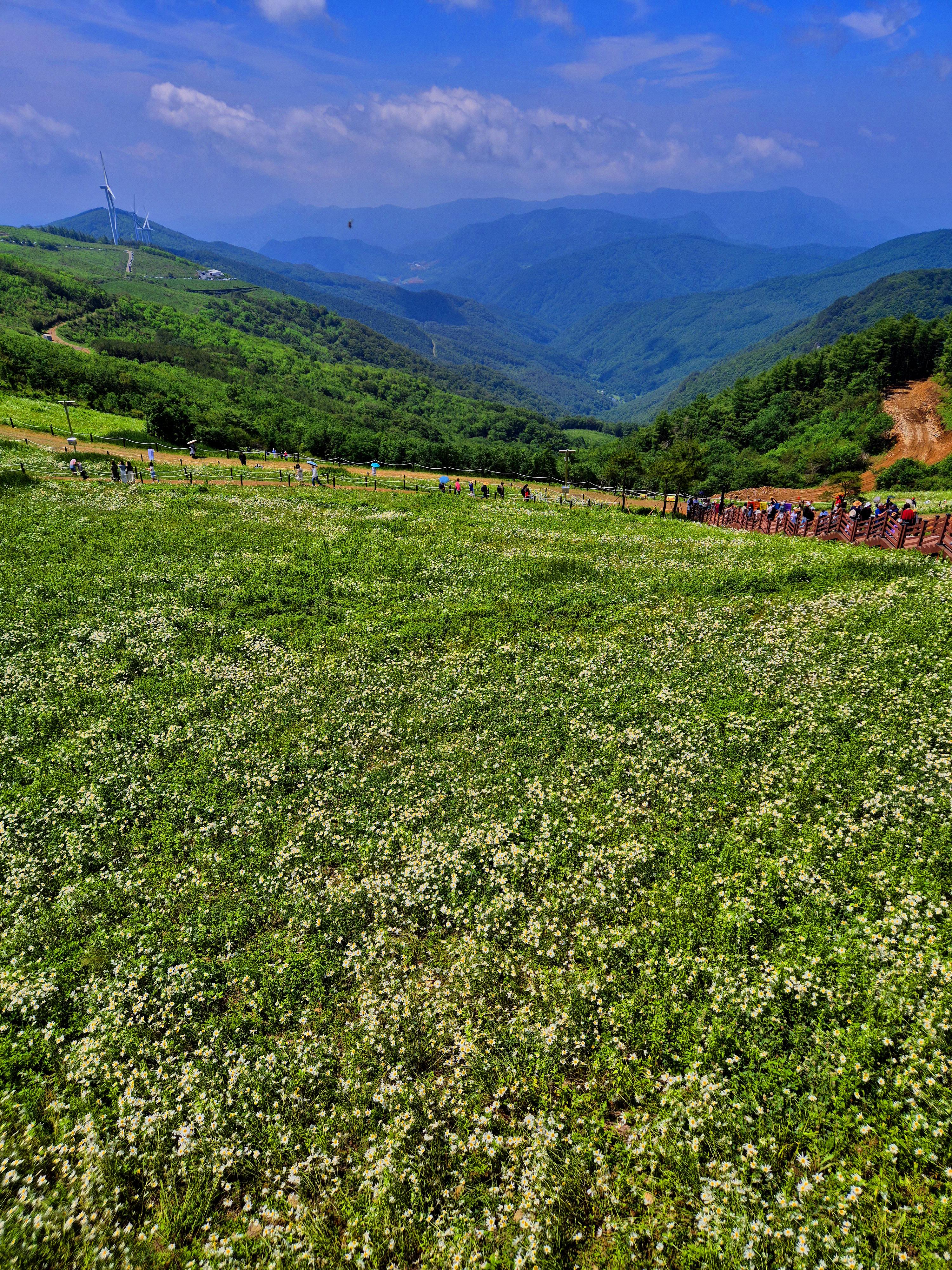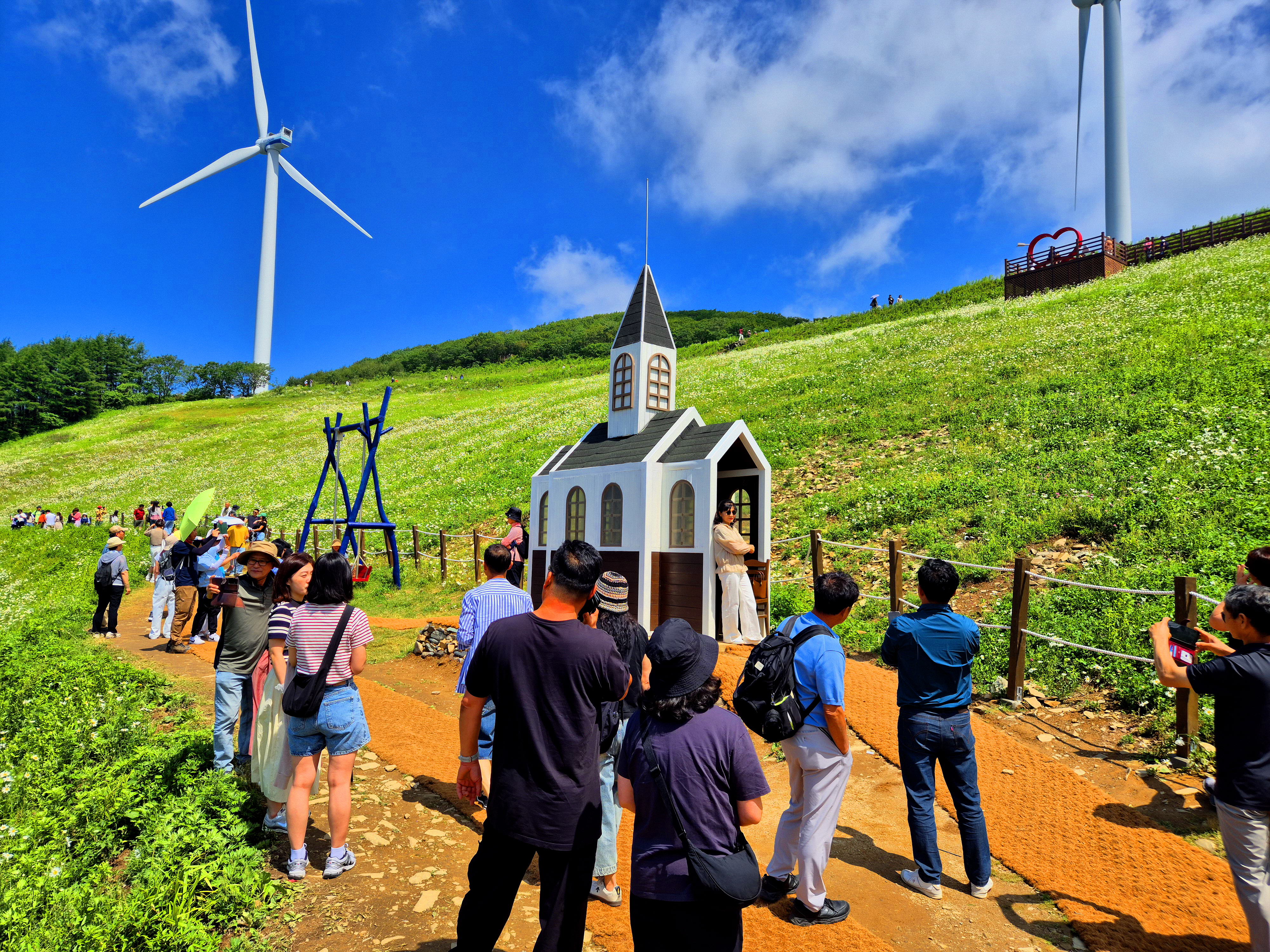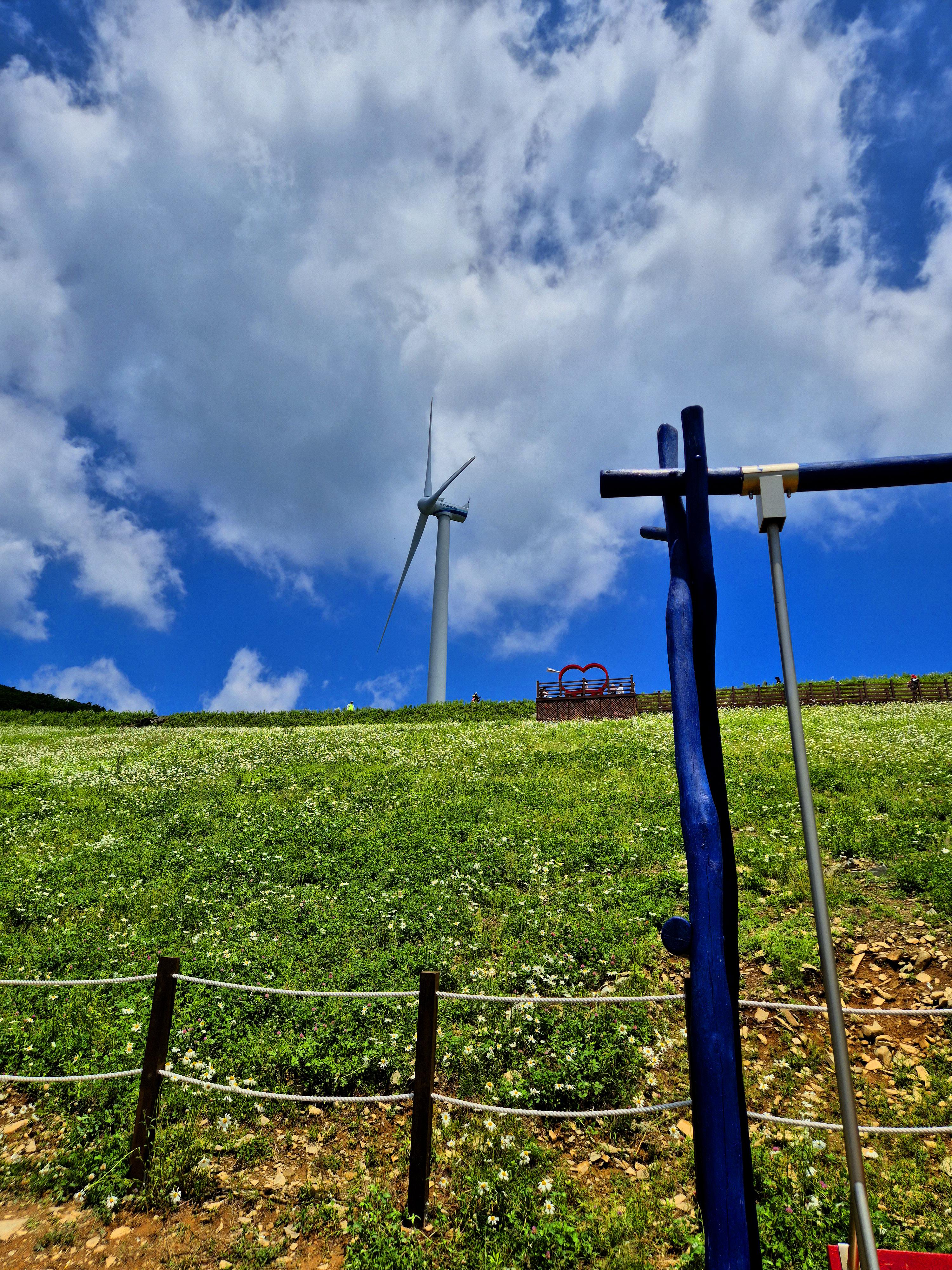 평창 청옥산 육백마지기는 ‘볍씨 육백 말을 뿌릴 수 있을 정도로 넓은 평원’이라 하여 붙여진 지명이다. 오늘날 육백마지기는 자동차로 쉽게 오를 수 있는 산 정상이자 자연 친화적 관광명소로 떠올랐다. 산길을 따라 올라가다 보면 능선을 따라 풍력발전기가 보이기 시작한다.