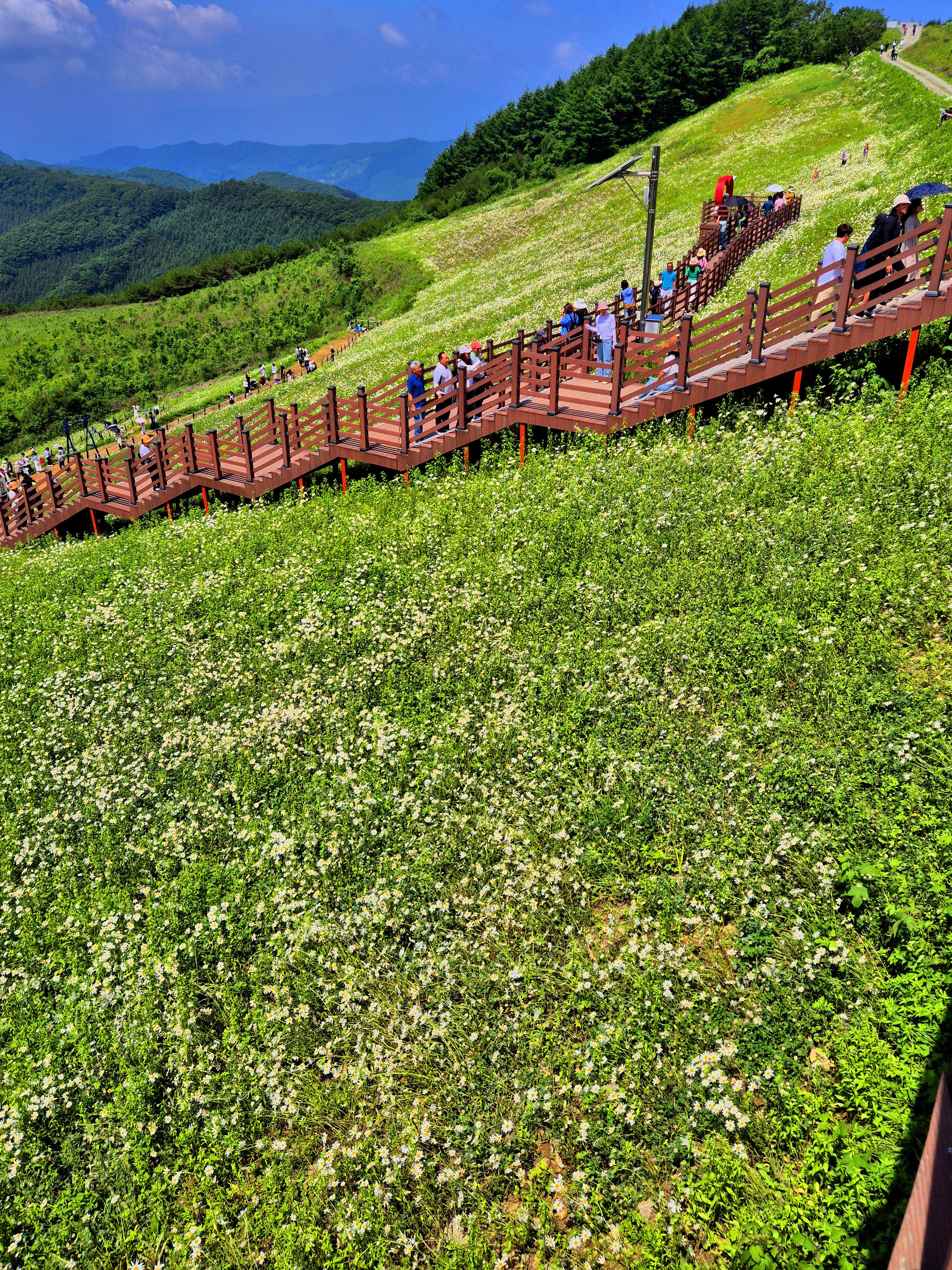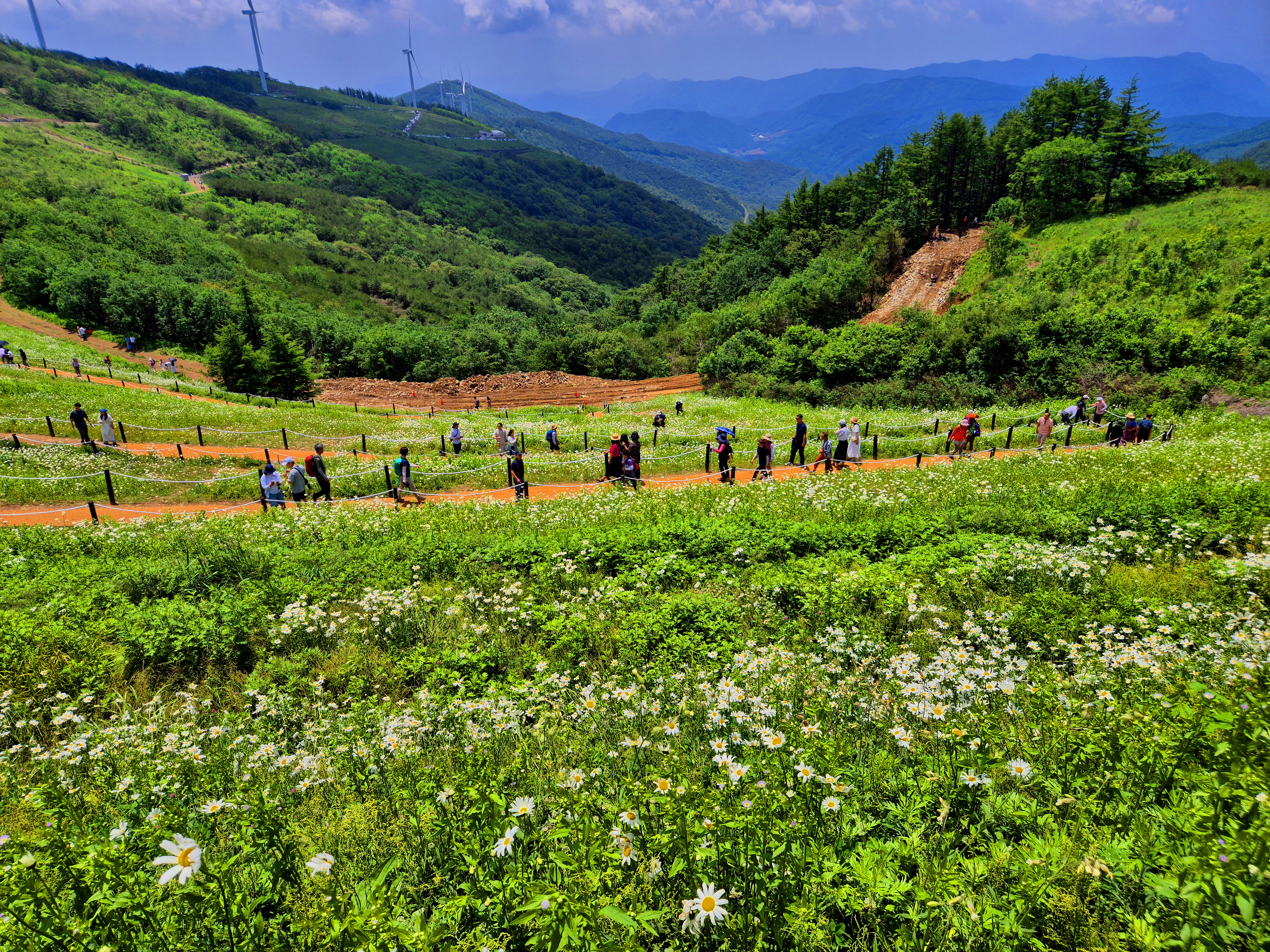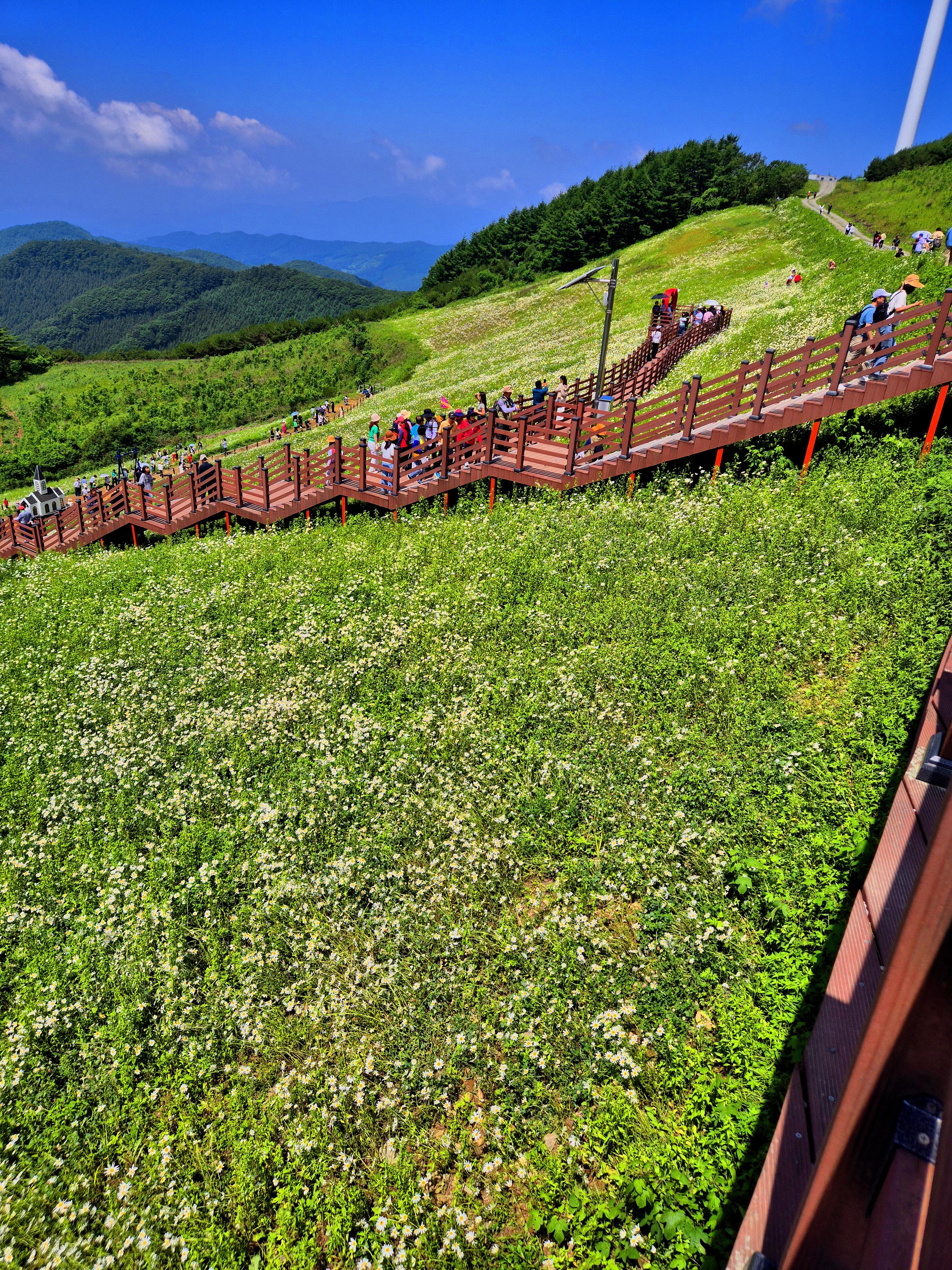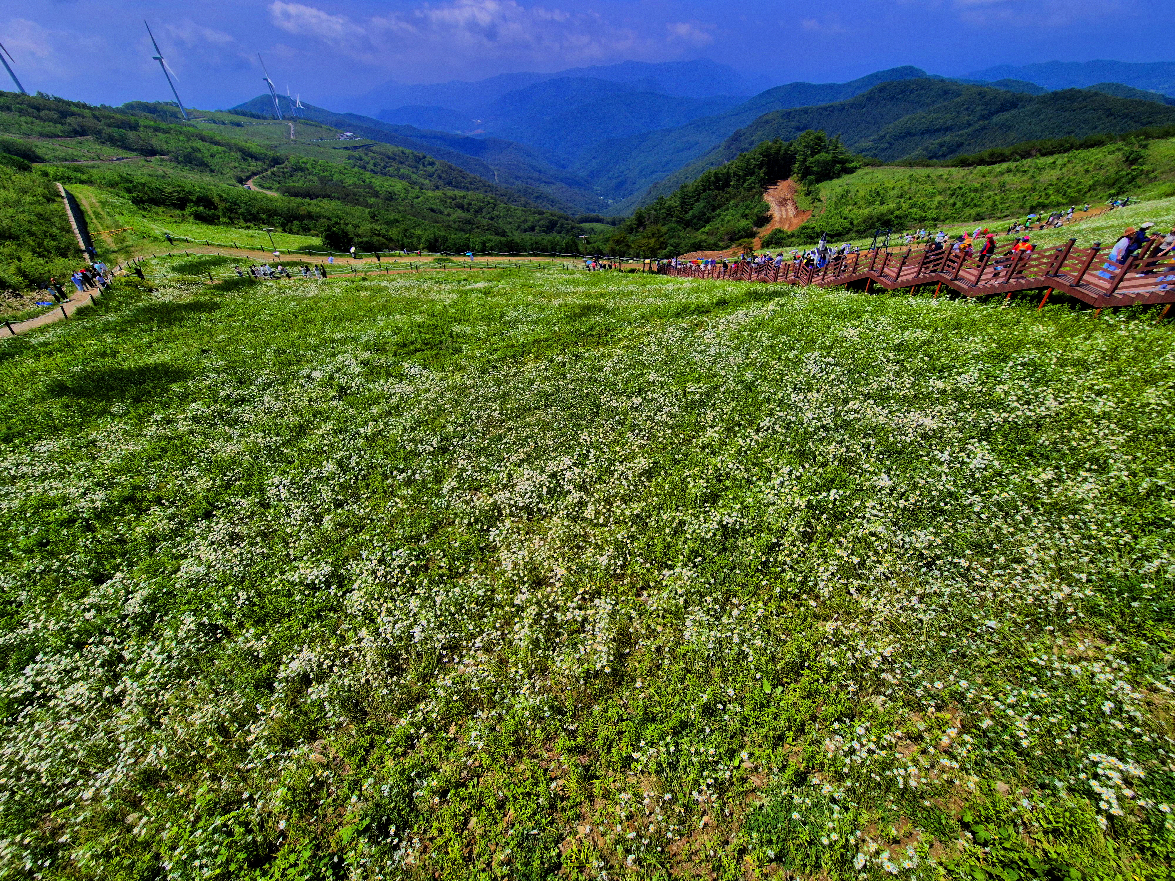 평창 청옥산 육백마지기는 ‘볍씨 육백 말을 뿌릴 수 있을 정도로 넓은 평원’이라 하여 붙여진 지명이다. 오늘날 육백마지기는 자동차로 쉽게 오를 수 있는 산 정상이자 자연 친화적 관광명소로 떠올랐다. 산길을 따라 올라가다 보면 능선을 따라 풍력발전기가 보이기 시작한다.